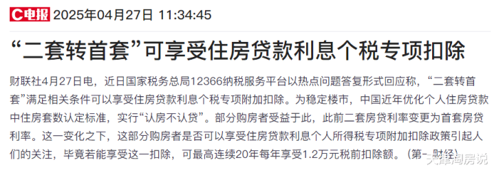 近日又曝出,“二套转首套”可以享受贷款利息个税专项扣除。